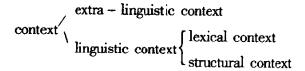 一般说来,所谓上下文指一个单词所在的句子以及出现在这个句子前边和后边的句子。还有人认为使用这些语言的具体情景及整个文化背景也可以看作一种上下文,对猜测词义有帮助。这样关于上下文我们可以得到以下分类:
