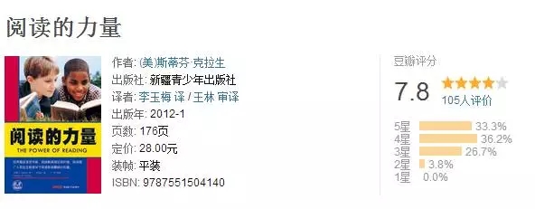 这本相见恨晚的书叫(《阅读的力量:从研究中获得的启示》The Power of Reading: Insights from the Research)。作者Stephen D. Krashen回顾总结了大量关于儿童阅读和语言能力的研究,除一小部分个案研究外,大部分是实验性研究,也就是说,学者随机选择两组孩子,一组为实验组,坚持自由阅读,另一组为控制组,继续按传统教学方法学习语言,进行一段时间后——短则几个月,长则一年以上,比较孩子在实验前后的标准化考试成绩,以此判断两种学习方法的高下。