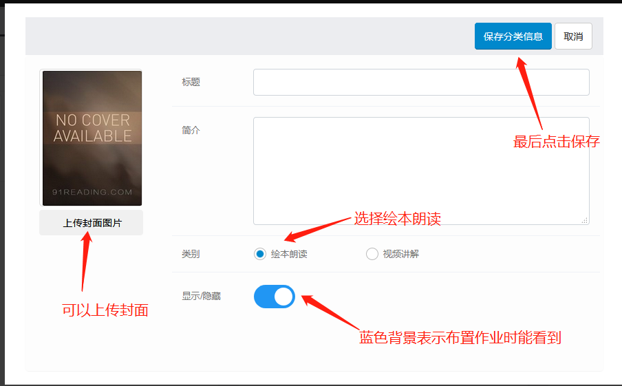 填入课本信息,标题,简介,可以上传封面,【显示/隐藏】按钮可以选择布置作业时是否显示课本。最后点击右上【保存分类信息】按钮。
