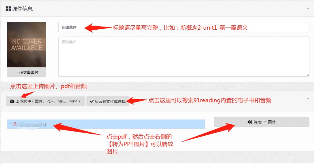 点击【新建朗读课件】,输入标题,简介和上传图片。