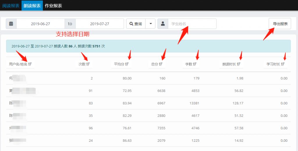 【朗读报表】支持搜索特定用户名查看数据。可以点击“用户名”,“次数”,“平均分”,“总分”,“字数”,“朗读时长”,“学习时长”,降序排序或者升序排序。支持导出报表。