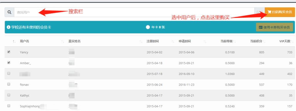 登录APP后台管理网站→财务管理→购买会员,选择要购买VIP的用户,也可以通过搜索栏直接搜索。如果搜索选中多个用户,逐个搜索选中即可。然后点击【扫码购买会员】。